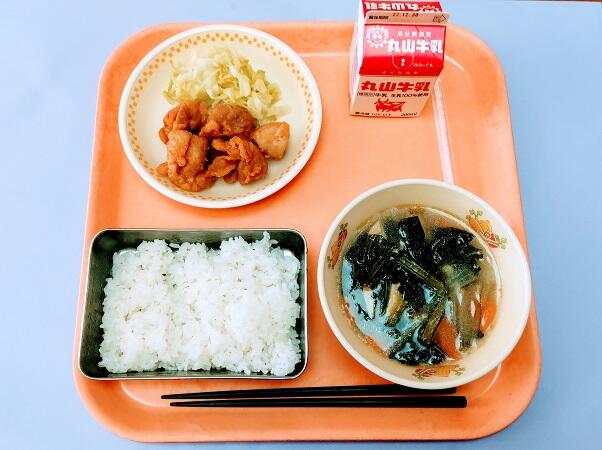 今日の献立は、ご飯、牛乳、フライドチキン、キャベツ添え、野菜スープです。