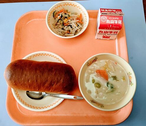 今日の献立は、黒糖パン、牛乳、冬野菜のクリーム煮、ゴボウサラダです。冬野菜のクリーム煮は、白菜、カリフラワー、タマネギ、あおまめなどの野菜がたっぷりと入っていて、特に白菜がシャキシャキして、歯ごたえもあり、とてもおいしかったです。チーズの香りもして、子どもたちが好んで食べれる味でした。寒い日には体も温まりとてもいいですね。