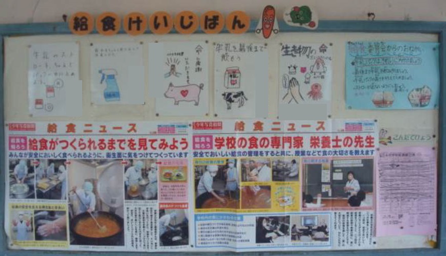 下の給食委員会の掲示板では、子どもたちが作成したもの「生き物の命をいただいているポスター」「牛乳を最後まで飲むことを呼びかけるポスター」「牛乳パックをきちんとたたむポスター」でみんなに啓発しています。