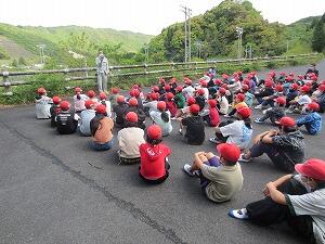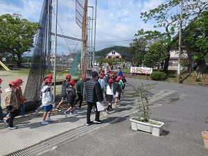 その後、津波が来るとの想定で、今度は町グラウンド上のパーキングに避難します。全員で移動するのでどうなるかと思っていましたが、6年生が1年生のお世話をするなどして、整然と避難場所まで移動することができました。