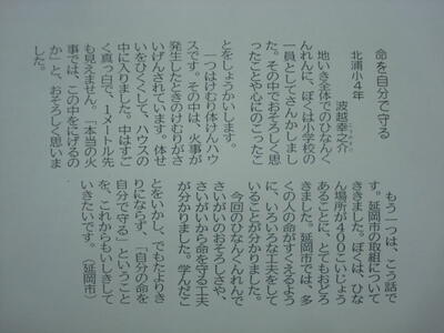 今日は地震・津波に関わる避難訓練を行いました。まず、地震が起きたときにどうするかを各学級で指導します。その後、実際に地震が起きた想定で、机の下にもぐって頭を保護する練習をします。この時に大事なのは、地震で机が倒れてしまわないように、机の脚をしっかりと握っておくことです。ちゃんと言っておかないと、先生が「机の下にもぐって、足をしっかりにぎりなさい!」と言った時に、子どもが自分の足をにぎってしまうのはよくある話です。