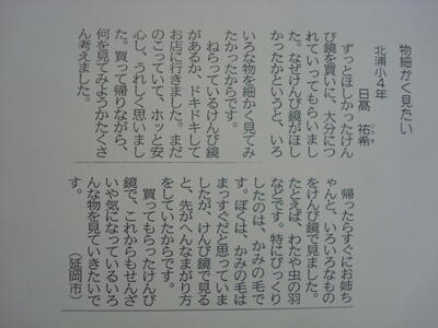 ↑ 顕微鏡がとてもほしかった思いが、文中の「ねらっているけんび鏡があるか、ドキドキしてお店に行きました。まだ、のこっていて、ホッと安心し、」に表れていますね。「まだ、のこっていて」という言葉から、以前にもこのお店に来て、どんな顕微鏡があるか確認し、そのときに気に入ったものがあったことがうかがえます。ぜひ、いろいろな小さなものを顕微鏡で見て、発見してくださいね。科学者への第一歩かな