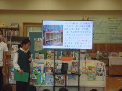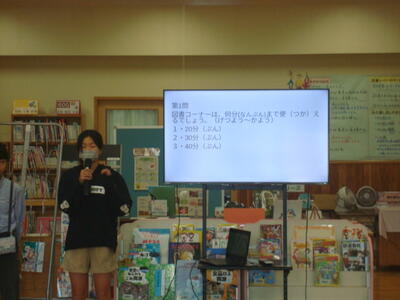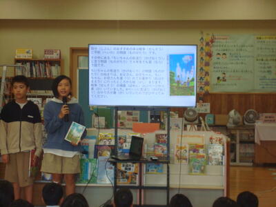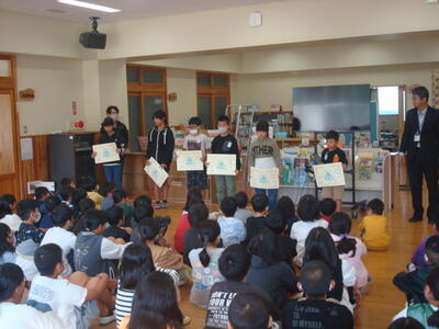 10月24日の全校集会では、図書委員会の子どもたちが、おすすめする本の紹介、イベント紹介(読書ビンゴ・しおりコンテスト)、図書コーナーに関するクイズ等を行いました。図書委員会の子どもたちは、自分の担当役割をしっかり果たし、説明の台詞も覚えて、しっかり堂々と伝えることができました。説明中の姿勢もよかったですよ。図書委員会の発表を聞いた子どもたちは、もっと本を読もうという気持ちが高まった感想を言っていました。そのように伝わってうれしいです。