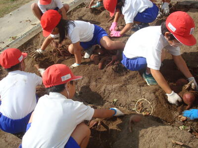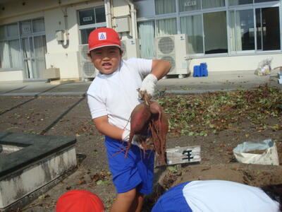 子どもたちは、イモの大きさにびっくりしたり、なかなか抜くことができなくて苦労したり、様々な歓声が上がっていました。