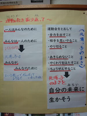 全校朝会において、校長の方から運動会の振り返りと、今後の目標づくりに関する話をしました。校長からの運動会の振り返りは下の写真のような内容で伝えました。