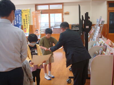 ↑ 県文集「ともだち」に作品掲載となった子どもの表彰です。