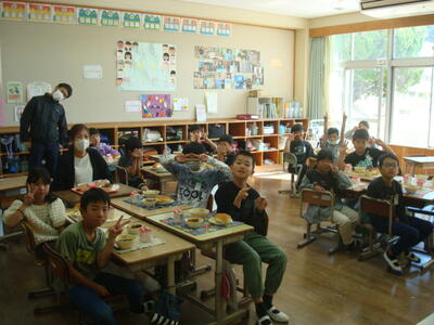 給食試食会では、お子さんのいる学級に入ってもらって、一緒に給食を食べてもらいました。