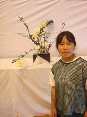 下の写真は、生け花の作品を出してくれた子どもたちです。3人とも生け花初段ということで、びっくりした作品でした。