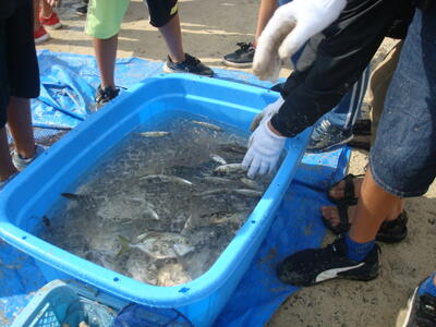 海洋教育の一環で、5・6年生は地引き網を体験しました。写真は網を引っ張っている所です。