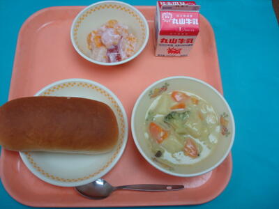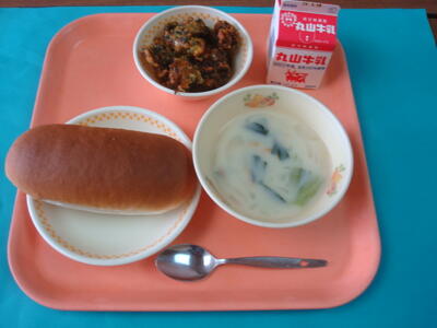 ↑ 今日の給食は、ミルクパン、牛乳、ブイヤベース、ひじきとゴボウのサラダでした。