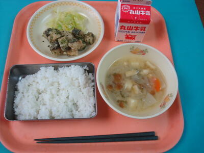 ↑ 今日の給食は、ごはん、牛乳、あじの磯辺揚げ、キャベツ添え、なめこ汁でした。