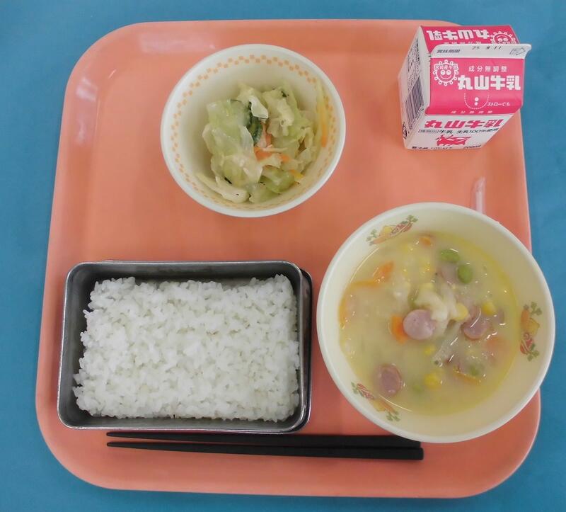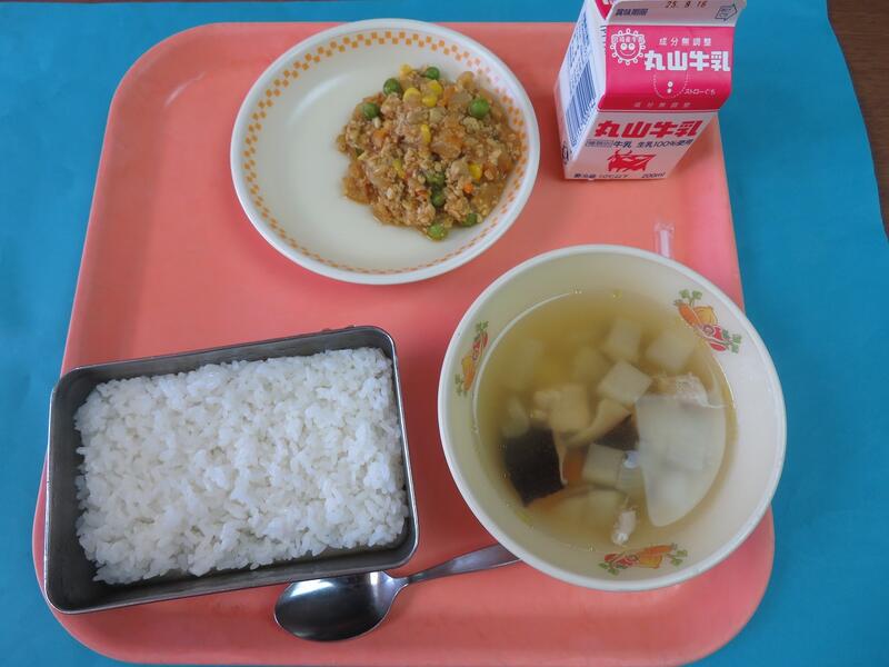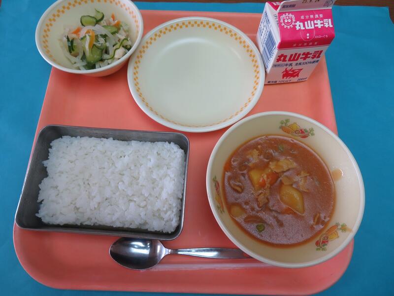 ↑ 今日の給食は、ごはん、牛乳、ドライカレー、コロコロ野菜スープ です。