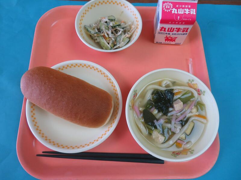 ↑ 今日の給食は、減量コッペパン、牛乳、五目うどん、ごぼうサラダです。