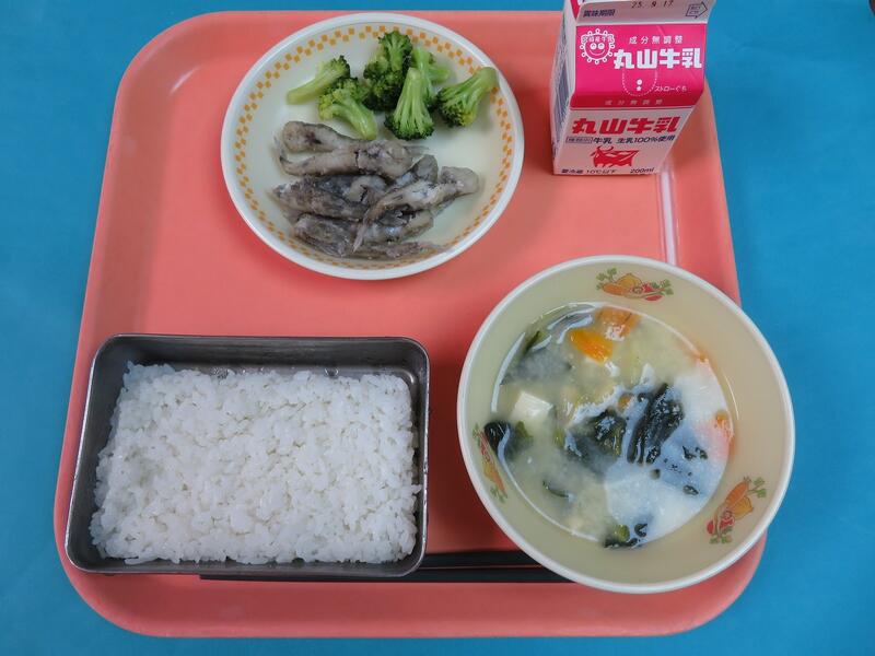 ↑ 今日の給食は、ごはん、牛乳、めひかりの唐揚げ、ゆでブロッコリー、あすか汁 です。