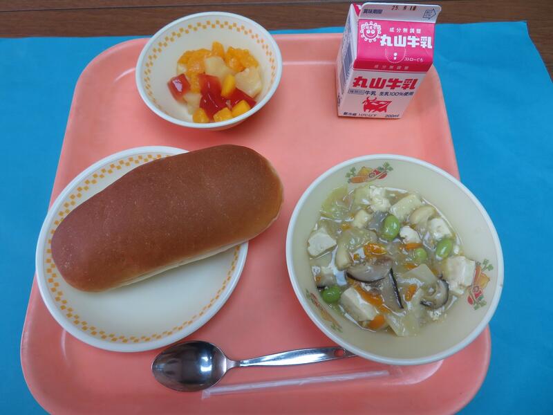 ↑ 今日の給食は、ミルクパン、牛乳、豆腐の中華煮、フルーツポンチ です。