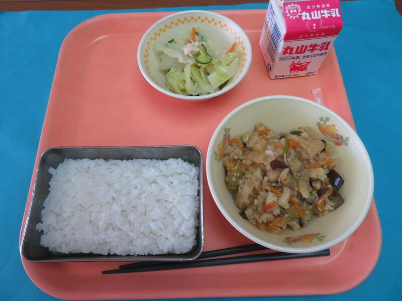 ↑ 今日の給食は、ごはん、牛乳、麻婆なす、バンバンジー でした。