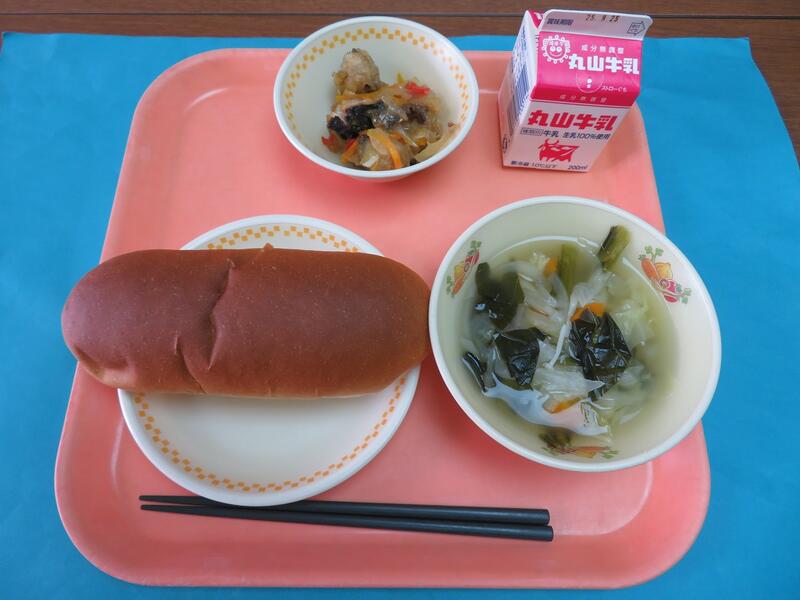 ↑ 今日の給食は、黒糖パン、牛乳、魚のレモンマリネ、コンソメスープ です。