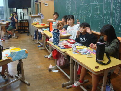 ↑ 2年生では、自分たちが考えて作ったゲームを保護者の方にもやってもらいました。写真では感想を発表しているところです。子どもたちで進行をして進めています。このような経験が上の学年になったときに役立ってきますね。ゲームに参加してくれた保護者の方にも感想を発表してもらいました。楽しかったことや懐かしかったこと、修理コーナーも準備していて用意がよいことなどの感想をいただきました。