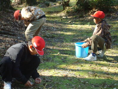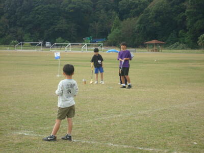 交流内容は、1年生が考え作成したゲームや作るものでした。松ぼっくりや紙コップを使って物を作ったり、空気を利用した卓上サッカーゲーム、松ぼっくりの輪ゴム弓矢で紙コップタワーあて、よくバカと呼んでいる植物の実(本当はオナモミ)を的に当てるゲームなどを準備して遊びを通して交流しました。