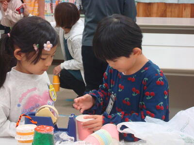 ↑ 輪ゴム弓矢に、松ぼっくりをはめるやり方を教えています。紙コップタワーを全部倒すと、手作り景品があったようです。