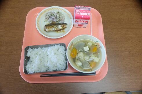 今日の献立は、ご飯、牛乳、鰯のおかか煮、ゆかり和え、けんちん汁