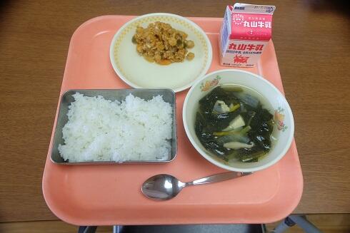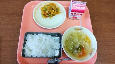 今日の献立は,ご飯、牛乳、揚げかつおのかおり和え、豆乳みそ汁
