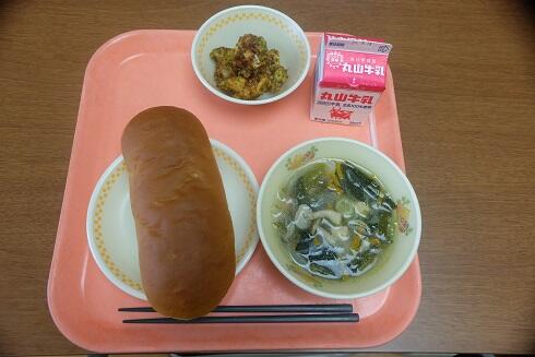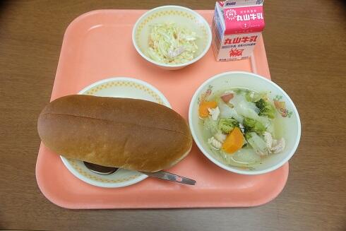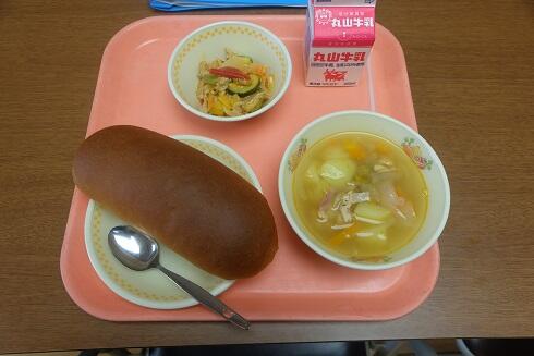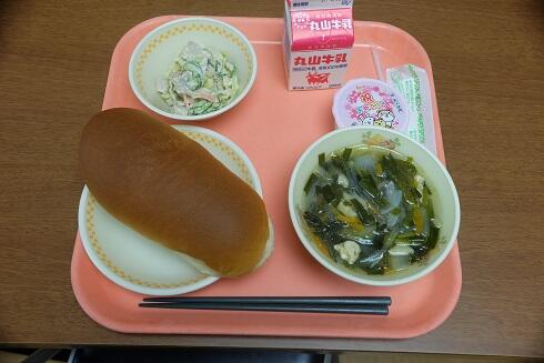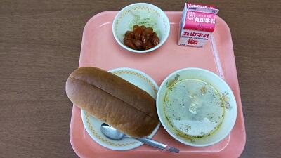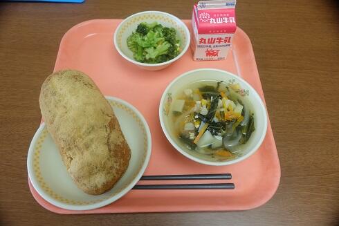 今日の献立は、牛乳、黒糖パン、たこやきふう、中華スープです。