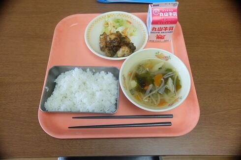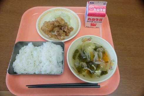 今日の献立は、ご飯、すまし汁、みやざき地鶏っこのから揚げ
