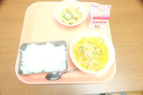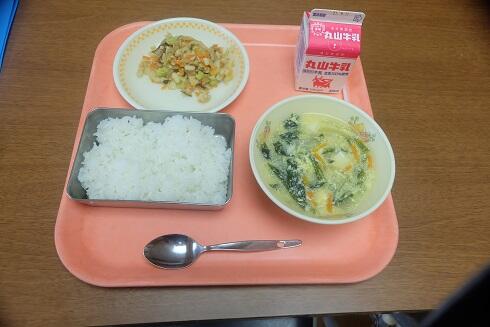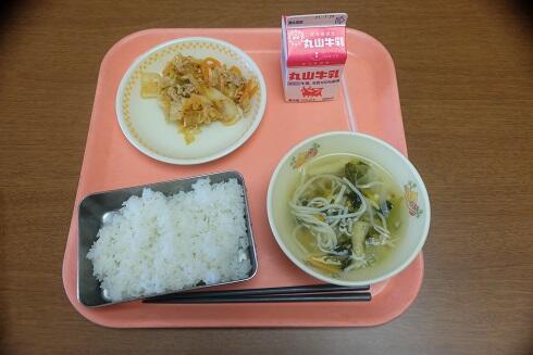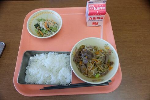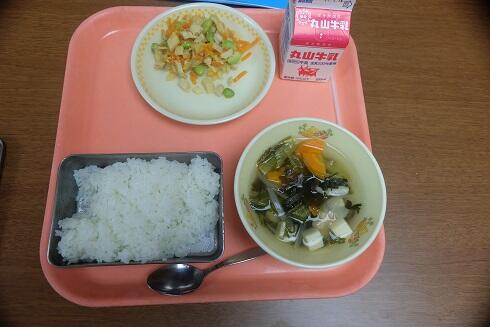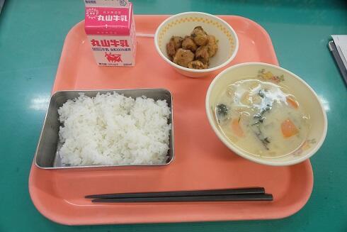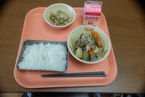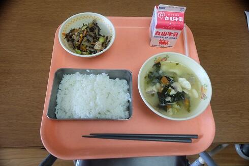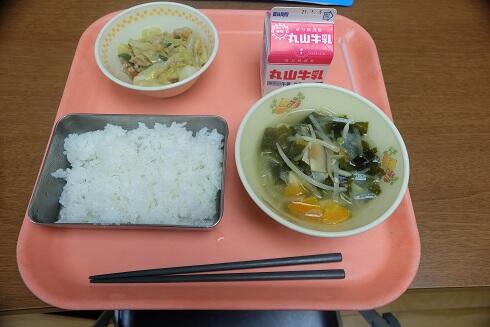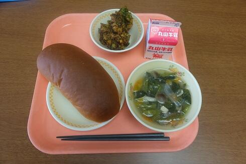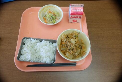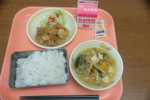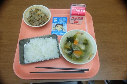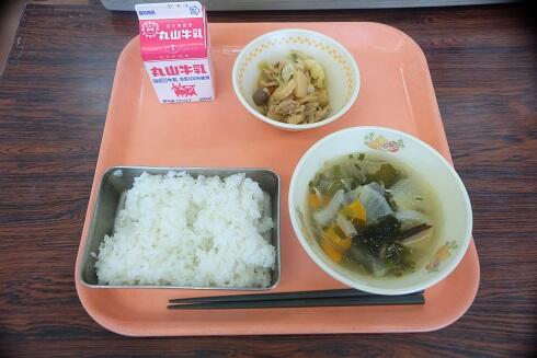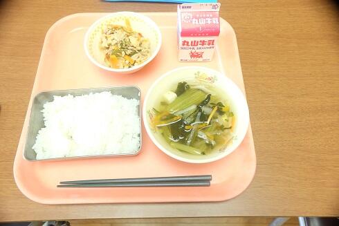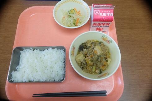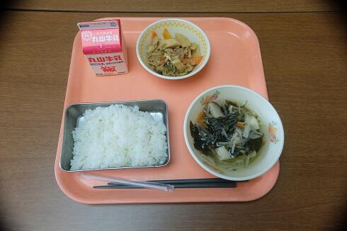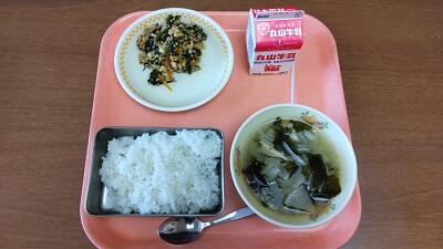 今日の献立は、ご飯、牛乳、豚肉と厚揚げの味噌煮、磯香和えです。