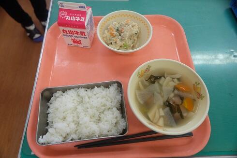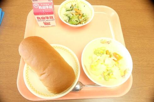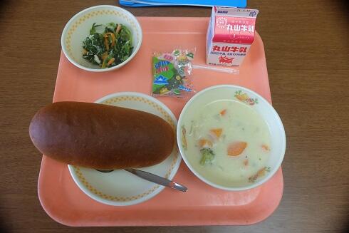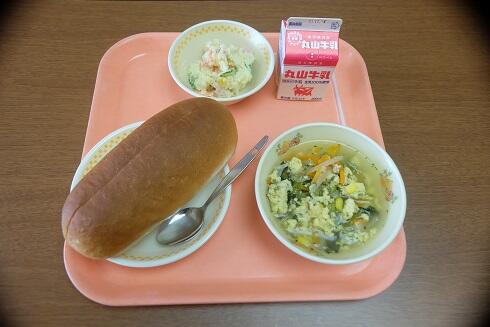 今日の献立は、ポテトサラダサンド、牛乳、ふわふわスープです。