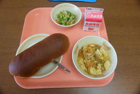 今日の献立は、黒糖パン、牛乳、豆腐チリソース