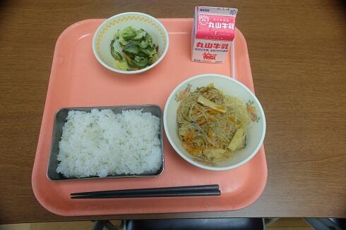 今日の献立は、麦ご飯、牛乳、チャプチェ、海藻サラダです。