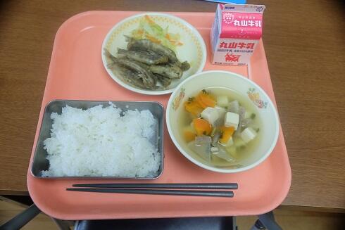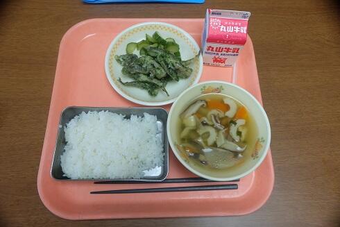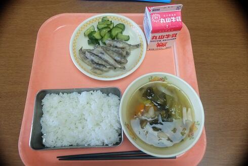 今日の献立は、ご飯、牛乳、めひかりの唐揚げ、キュウリの塩もみ、