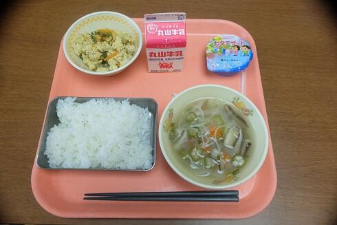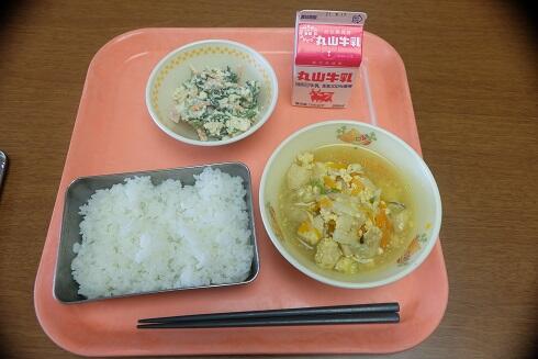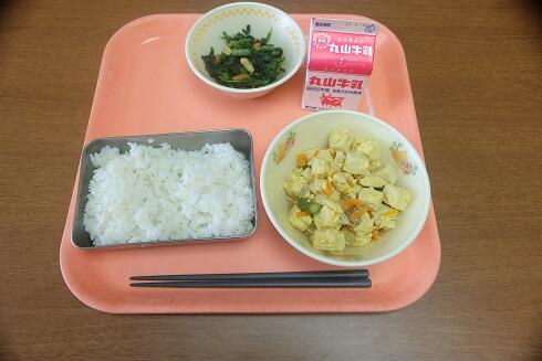 今日の献立は、牛乳、麦ごはん、高野豆腐の卵とじ、おひたしです。