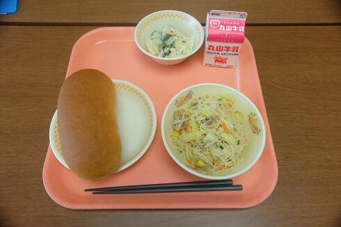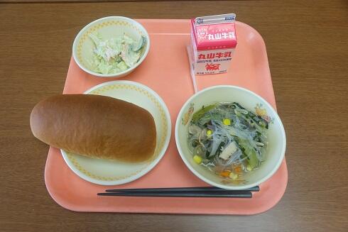 今日の献立は、牛乳、減量コッペパン、太平燕、納豆サラダです。