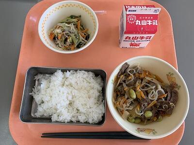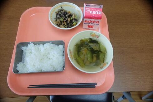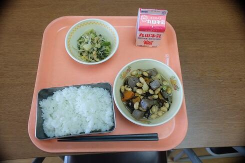 今日の献立は、ごはん、牛乳、大豆の磯煮、小松菜のごま和えです。