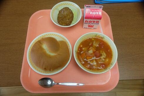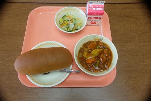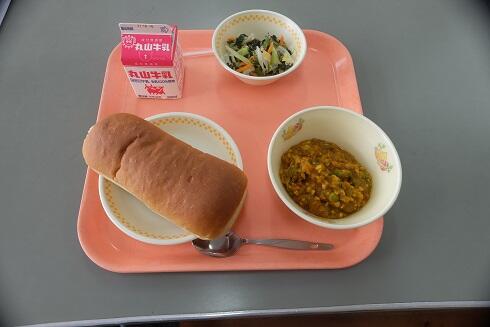 今日の献立は、ドライカレーサンド、牛乳、コンソメスープです。