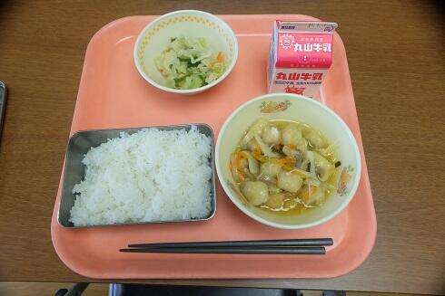 今日の献立はごはん、牛乳、揚げ魚のたこ焼きソースがらめ・添え野菜、すまし汁です。揚げ魚をたこ焼きソースがらめにしたメニューは初めてでしたが、とてもおいしかったです。魚の苦手な子どもも好んで食べられそうな味付けです。