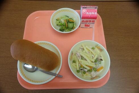 今日の献立は、ミルクパン、牛乳、豚肉のゴマ味噌マヨネーズ、マロニースープ、イチゴのお祝いゼリーです。