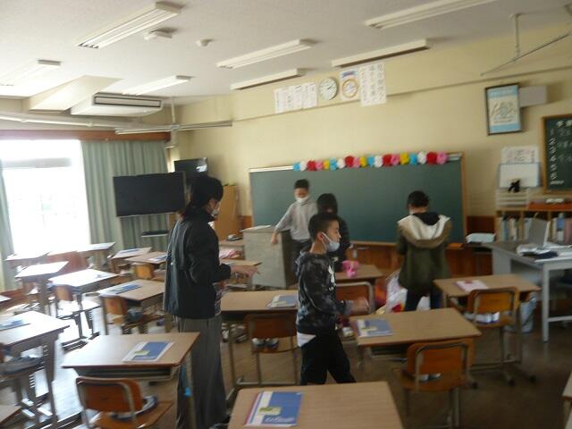 明日行われる入学式のために、5・6年生の児童が入学式の準備を行いました。教室や体育館、廊下や玄関などをきれいに清掃したり、いろいろな飾り付けやプランターの花を設置したりして、明日の入学式の準備を一生懸命に頑張りました。明日入学する1年生も気持ちよく入学式に臨むことができると思います。