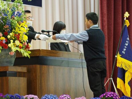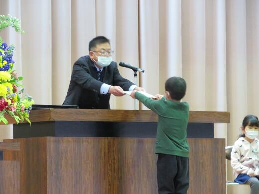 5人の児童代表(5年:吉田瑠育くん、4年:中口優くん、3年:髙須佳乃さん、2年:波越幸之介くん、1年:波越芽咲さん)が壇上で修了書を受け取りました。そのあとには、2人の代表児童が1年間を振り返っての作文を発表しました。