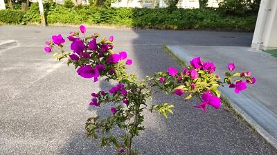 寒い冬に耐えたブーゲンビリアがきれいな花を咲かせ始めました。花と言ってもブーゲンビリアの花は紫色のところは包葉であり、中央部の白い小さな部分が花になります。初めて植えた年の冬は寒さで枯れやすいと聞いていたので、わらを敷いて寒さ対策を行った結果、無事全部の株が枯れずに、元気よく新葉が芽吹いています。これからどんどん色鮮やかになってくると思います。