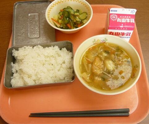 五目スープには、タケノコやタマネギ、ちんげんさい、にんじんなど、多くの野菜が入っており、栄養満点です。宮崎ハンバーグは、さすがに力がありました。ご飯ペロリです。子どもたちも大喜びでしょう。給食に感謝!