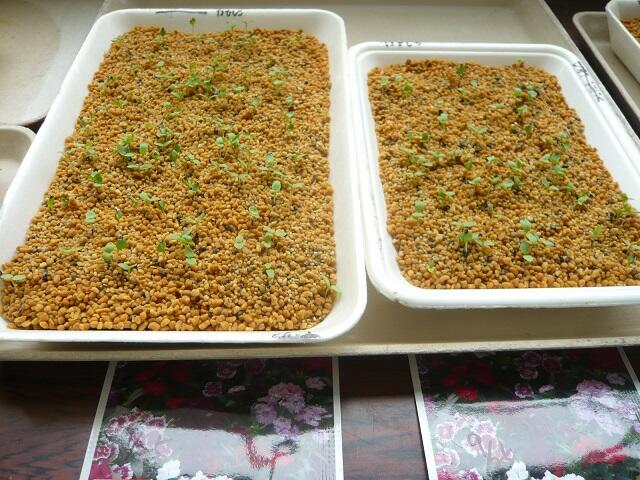 トレーに敷き詰められた土から小さな小さな双葉が顔を出しています。2ミリ、3ミリの小さな小さな芽です。なでしこ、アリッサム、シネラリア・・・。渡部先生が、春を見据えて、計画的に準備をされています。毎日毎日、発芽の様子と気温等の自然条件を考えての世話が続きます。秋・冬と乗りこえ、しっかりと根を張り、来る春にどんな花が咲くのでしょう。楽しみです。