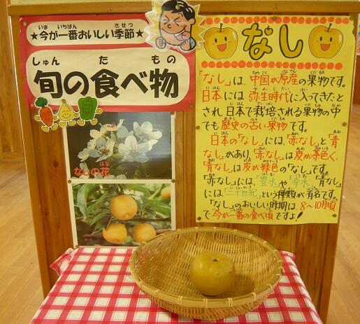 今回中川先生fが準備してくださったのは「なし」です。「くだものの中で【なし】が一番好き!」という人も多いのではないでしょうか?8月から10月が旬だそうです。季節の変わり目です。よく食べて、よく運動し、よく眠って、がんばりましょう!