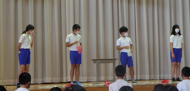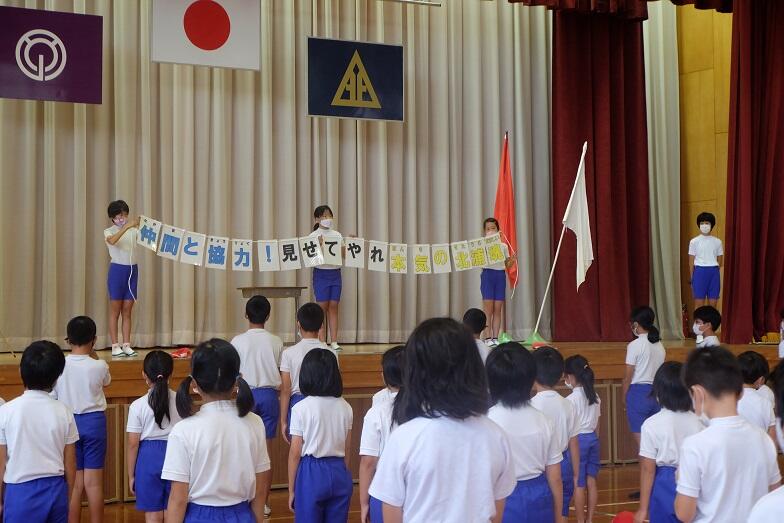 9月24日朝の時間に「結団式」を行いました。この日まで、体育委員会や計画委員会、団長・副団長・リーダーは昼休み等の時間を使って、準備をしてきました。いい準備を重ねてきたから、運動会へ向けて士気の高まるいい式となりました。今年のスローガンは「仲間と協力!見せてやれ、本気の北浦魂!」です。ぐっと力の入るとてもいいスローガンだと思います。赤団の団長は中西隆太さん、副団長は水木波那さん、白団団長は黒田右恭さん、副団長は甲斐杏寿さんです。感染症対策をしながら、規模縮小・短縮の運動会とはなりますが、今日の高学年の動きや表情を見ていると、本気の北浦魂を見せてくれそうです。これから一か月、北浦小にとって、一人一人の子どもたちにとって、大切な学びの場への挑戦です。かけっこでもいい、表現でもいい、係の仕事でもいい、整列の仕方でもいい、「はい」という返事でもいい、応援でもいい、・・・。何か一つ、自分のめあてをもって、運動会へのぞんでほしいですね。次の自分へ向かって、がんばれ、みんな!