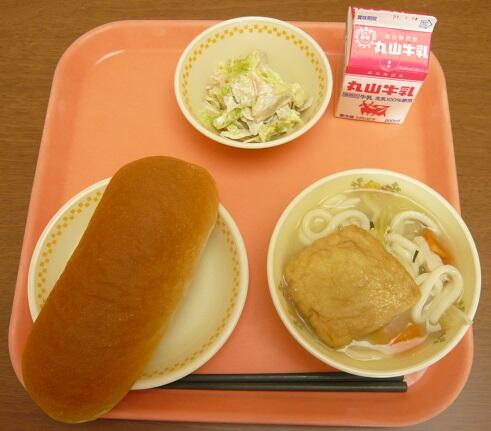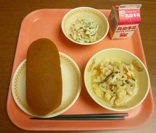 10月8日 卵とじうどん ゴマネーズサラダ コッペパン 牛乳