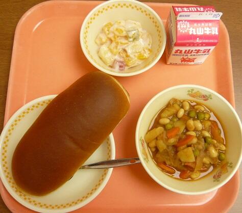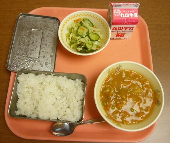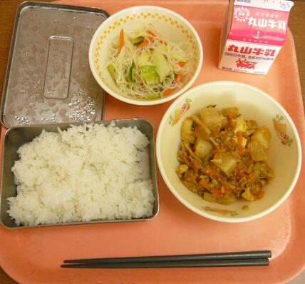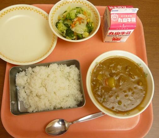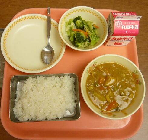 昆布に大豆、その他多くの食材が入っており、カレーなので子どもたちも喜んで、一気に栄養をとることができます。サラダは、ドレッシングの味で、食べやすく感じました。