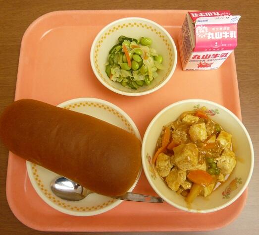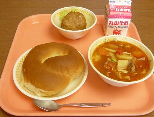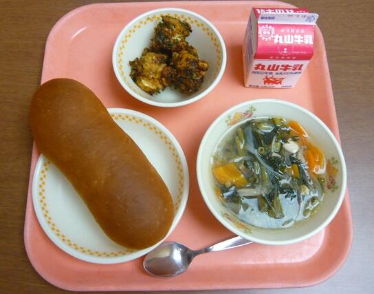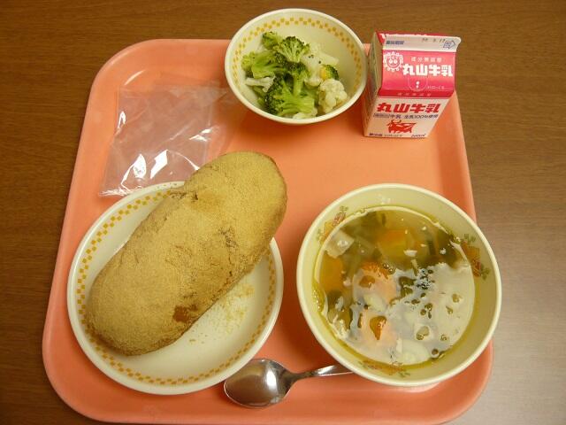 ブロッコリー、カリフラワー、小松菜、にんじん、タマネギ、しいたけなど、たくさんの野菜を摂取できるメニューです。そして、ふわふわカリカリのあげパンがなんともおいしいです。子どもたちも大喜びでしょう!!