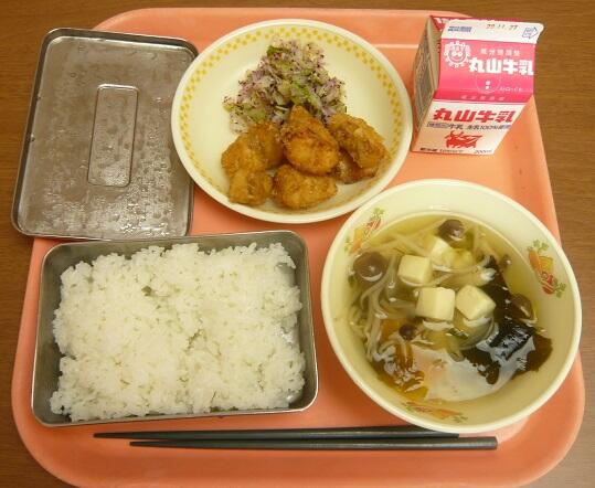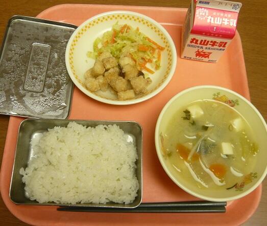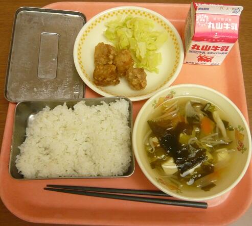 鶏肉の唐揚げ キャベツ添え すまし汁 ご飯 牛乳